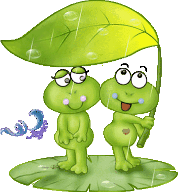 Two adorable green frogs share a moment of love under a large green leaf, using it as an umbrella from the rain.
