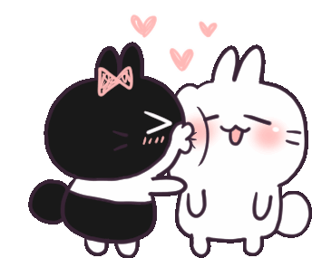 Bao, a black bunny, gives a sweet kiss to a white bunny, surrounded by floating hearts, showing affection.