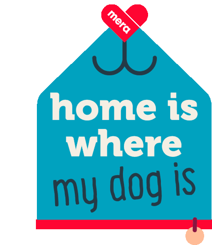 A heartwarming graphic featuring a blue house shape with the text 'home is where my dog is' and a red 'mera' heart.
