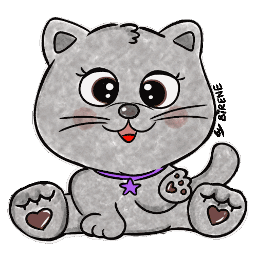 Adorable animated gray cat with a purple star collar, surrounded by floating hearts, created by Birene.
