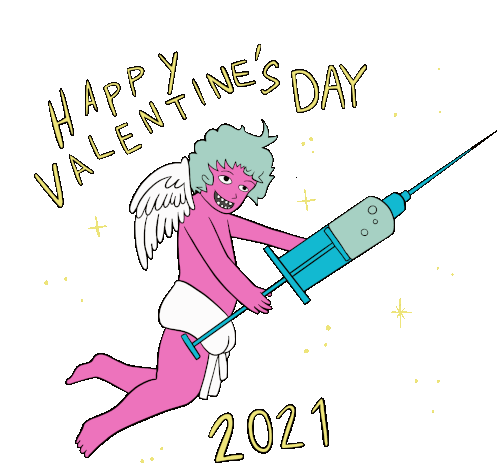 A humorous Valentine's Day sticker featuring a mischievous cupid holding a large vaccine syringe, with 'Happy Valentine's Day 2021' text.