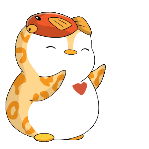 Adorable penguin-like character with a fish hat holds a large pink heart, expressing love and affection.