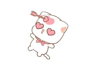 A charming cartoon cat-like creature with heart eyes, adorned with pink hearts and a love arrow, lying down.