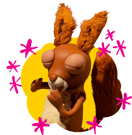 A shy and excited Shaun The Sheep squirrel character covers its mouth, surrounded by pink sparkles.