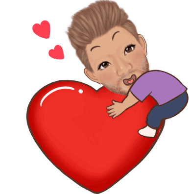 An adorable animated character embraces a large red heart, surrounded by smaller hearts, expressing deep affection.