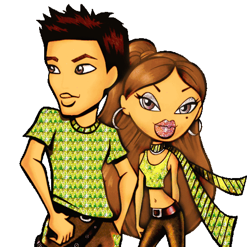 Bratz characters Eitan and Yasmin share a loving moment, sparkling with glitter in this animated sticker.