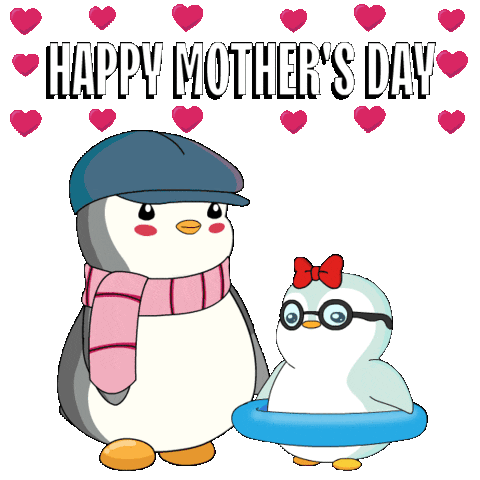 Adorable penguins share a loving hug, celebrating Happy Mother's Day with hearts and warm wishes.