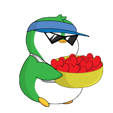 A cute green and white penguin wearing a visor and sunglasses holds a yellow bowl overflowing with red hearts, spreading love.