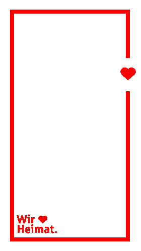 A vibrant red frame with a pulsating heart and the German text 'Wir ❤️ Heimat' (We love home).