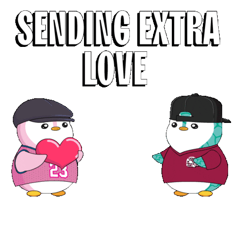 Two adorable cartoon penguins, one pink and one blue, send extra love with a floating heart. Perfect for sharing affection.