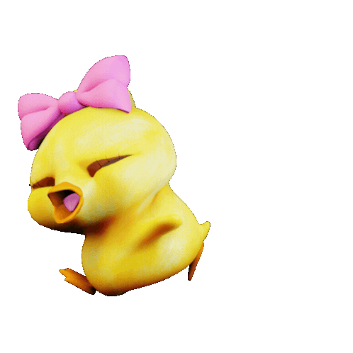 Adorable yellow chick Lola with a pink bow blows kisses, sending floating pink hearts. A sweet expression of love and affection.