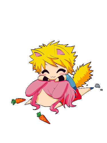 Chibi fox boy and bunny girl, possibly Krifai and Yuminerdy, share a loving embrace with a heart above.