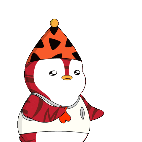 A cute pudgy penguin in a party hat shyly holds a red heart, expressing love or gratitude.