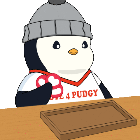 A cute Pudgy Penguin character in a beanie happily looks at a tray of heart-shaped treats, expressing love or desire for them.
