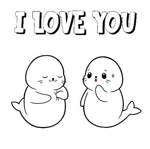 Two adorable cartoon seals express love with a heart and the caption 'I LOVE YOU', perfect for romantic messages.