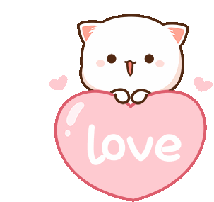 An adorable Mochi Peach Cat holds a large pink heart with "love" written on it, surrounded by smaller hearts.