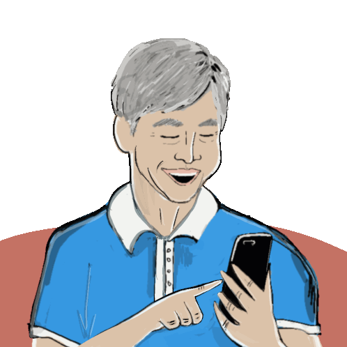 A happy man smiles while texting on his phone, with a pink heart symbolizing love.