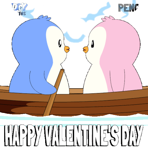two penguins kissing in a boat with the words happy valentine 's day