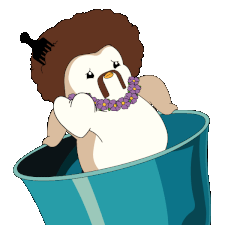 a penguin with an afro and a purple necklace is sitting in a blue bucket