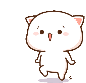A cute Mochi cat character happily walks and dances with a big smile, spreading love and joy.