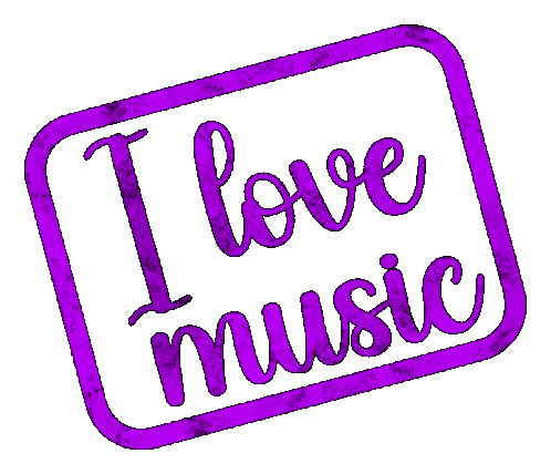 A vibrant purple stamp sticker featuring the phrase 'I love music' in a stylish, cursive font with a textured look.