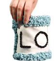 A hand holds a white cylindrical organizer pouch with fuzzy blue trim, displaying the letters 'VE'.