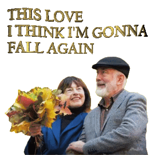 A senior couple smiles and holds hands with 'THIS LOVE I THINK I'M GONNA FALL AGAIN' lyrics, a romantic moment by AtraBilis.