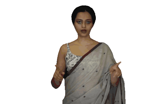 Sujata and Taniya from Suta Bombay dancing joyfully in a beautiful gray saree, expressing love and happiness.