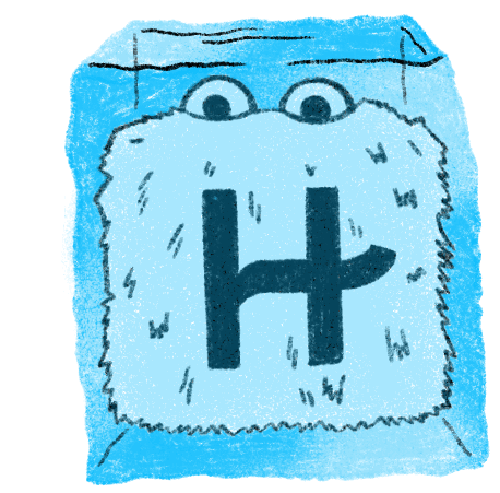 A fuzzy blue ice block with an 'H' and eyes, cracking as it freezes, symbolizing the Hinge dating app and winter love.