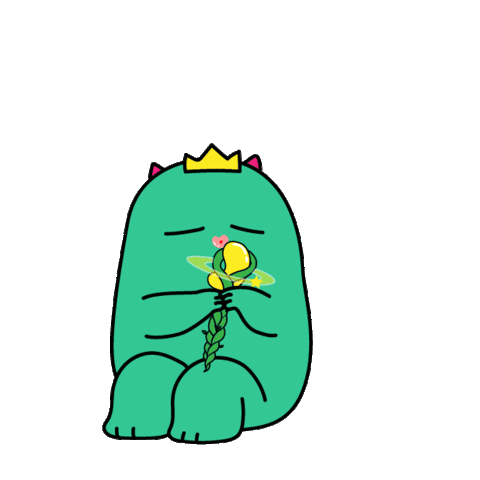 A cute teal monster with a crown receives a kiss from a small creature, then joyfully spreads pink hearts.