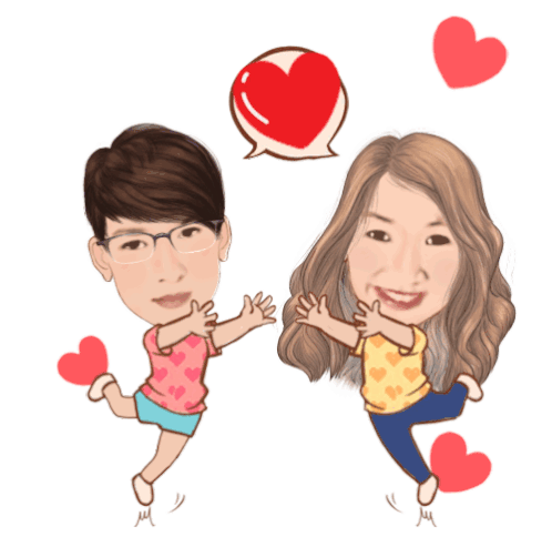 An animated chibi couple jumps towards each other, blowing kisses and surrounded by hearts, expressing love.