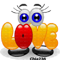 An animated "LOVE" text with a red heart for the 'O', which then transforms to show big blue eyes and a wide red smile.