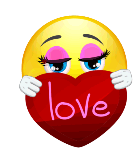 A shy emoji with pink eyeshadow holds a red heart displaying 'love', expressing deep affection with small floating hearts.
