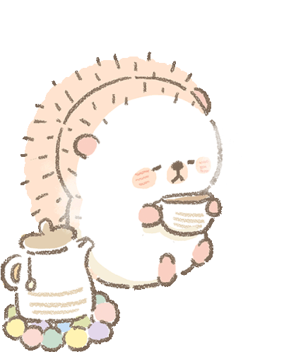 Cute animated sticker of Minihana the hedgehog enjoying a relaxing teatime, sipping from a cup next to a teapot.