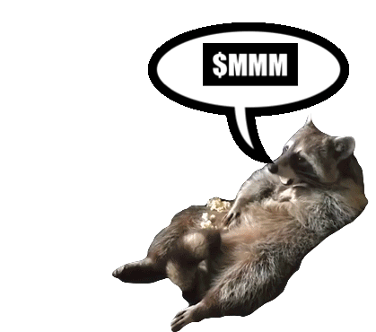 Lovemmm Raccoon lying down with a speech bubble saying '$MMM' and food on its belly.