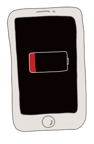 Animated sticker of a cartoon phone with a critically low battery, indicating a need for charging.