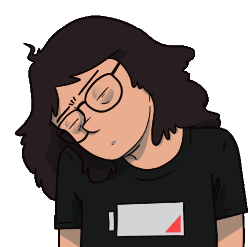 A tired cartoon character with glasses and a low battery shirt, showing exhaustion and low energy.