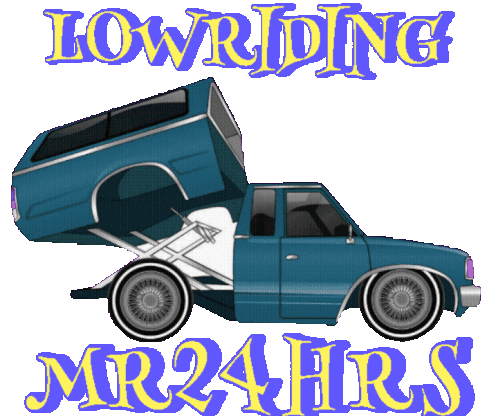 Animated lowrider truck with hydraulics lifting its bed, featuring "LOWRIDING" and "MR24HRS" text.