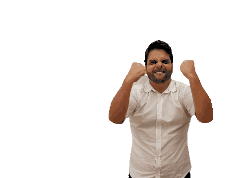 Lucas Studart, a man in a white shirt, flexes his muscles with a determined expression, then points upwards excitedly.