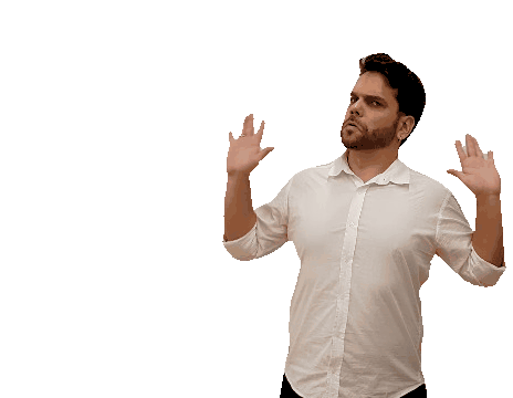Lucas Studart Pdz in a white shirt, shrugging with hands raised, expressing confusion or surrender.