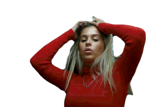 Dora, a young woman, runs her hands through her blonde hair, getting ready for a night out, looking confident.