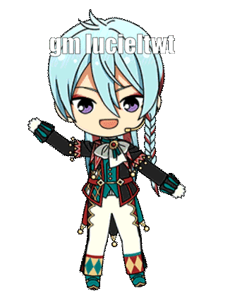 Wataru Hibiki from Ensemble Stars, a chibi character, greets with 'gm lucieltwt' in a vibrant animated sticker.