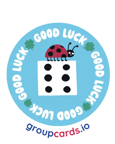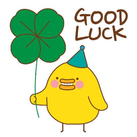 A cute, blob-like character with a red flower on its head, hands clasped, wishing good luck amidst floating petals.