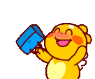 Qoobee, the cheerful yellow cartoon character, performs a happy dance while holding a blue cup, celebrating lunch time.