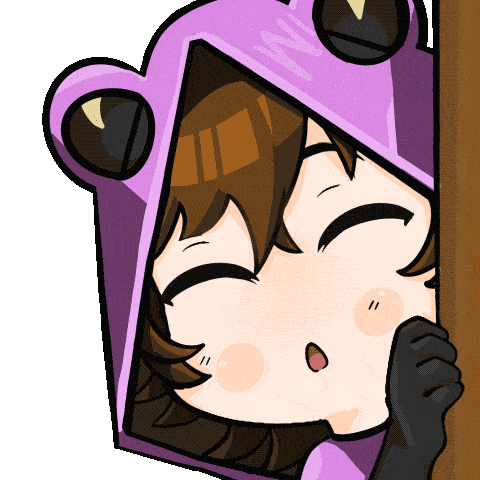 An adorable anime girl in a purple frog hoodie peeks out playfully, then hides, then peeks again, showing curiosity.
