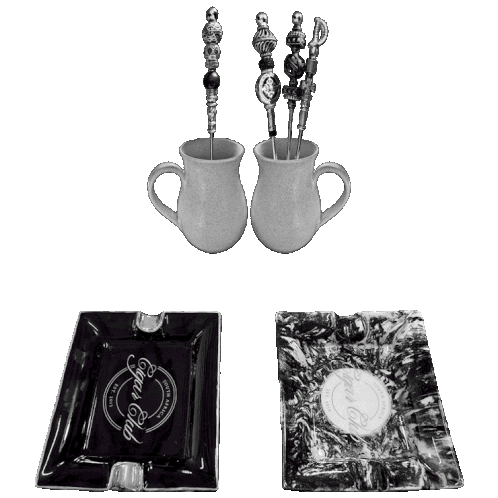 A collection of Luxury Club SA and Cigar Club SA merchandise, including ceramic mugs with decorative stirrers and branded ashtrays.