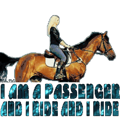 Animated sticker featuring a blonde woman riding a horse, displaying lyrics from Iggy Pop's song 'The Passenger'.