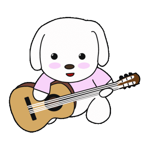 A cute white cartoon dog wearing a pink shirt happily plays an acoustic guitar, creating a cheerful music sticker.