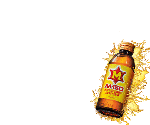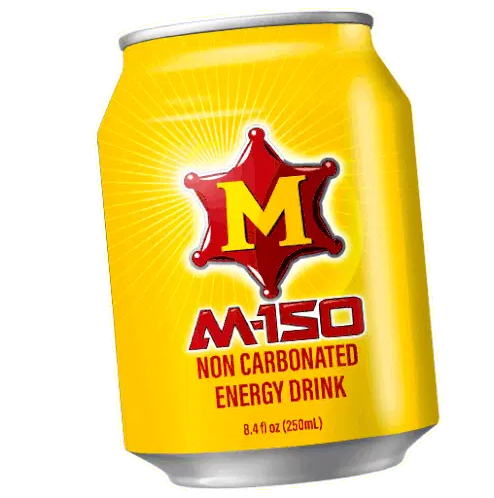 A vibrant sticker featuring an M-150 non-carbonated energy drink bottle with an energetic splash effect.