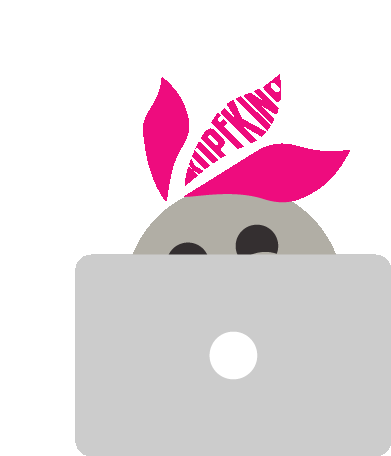A grey character with pink 'Kopfkino' ears winks and smiles playfully from behind a grey laptop.
